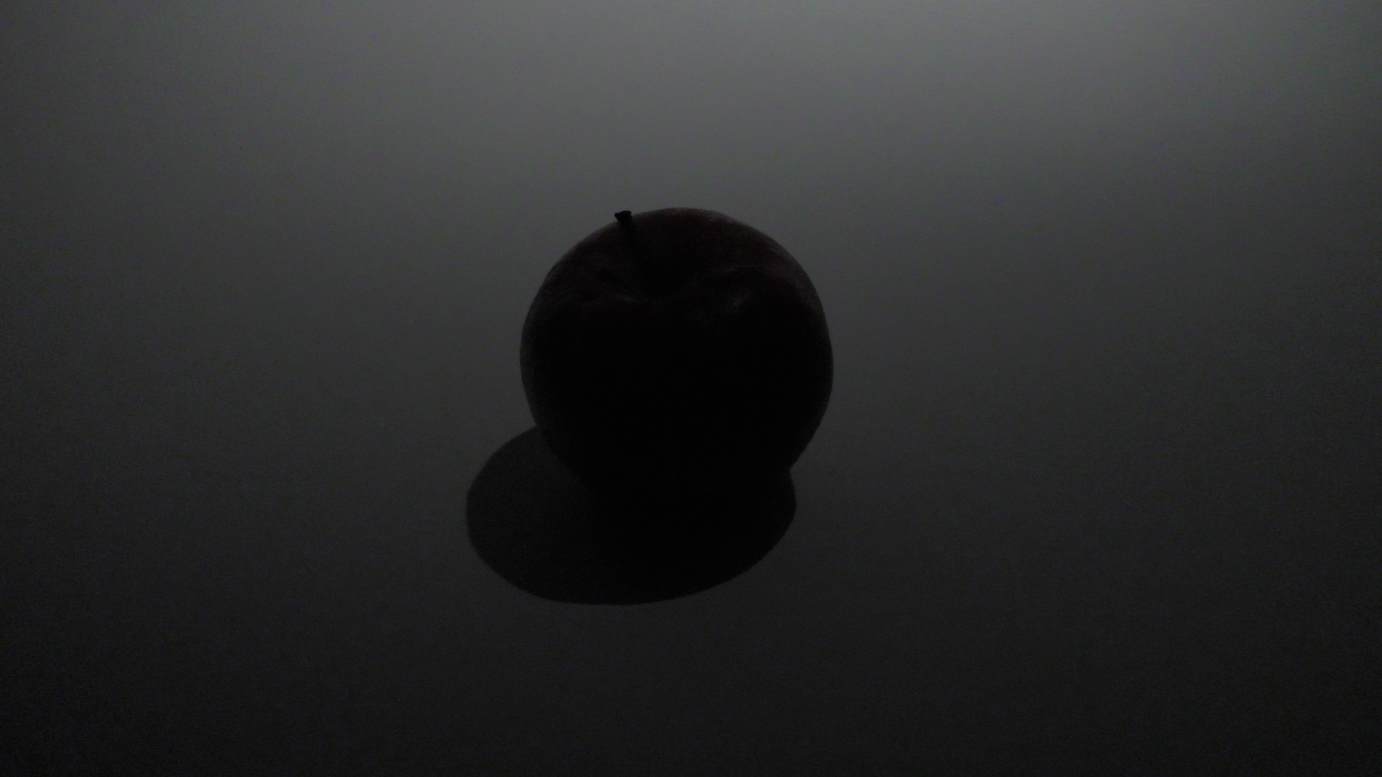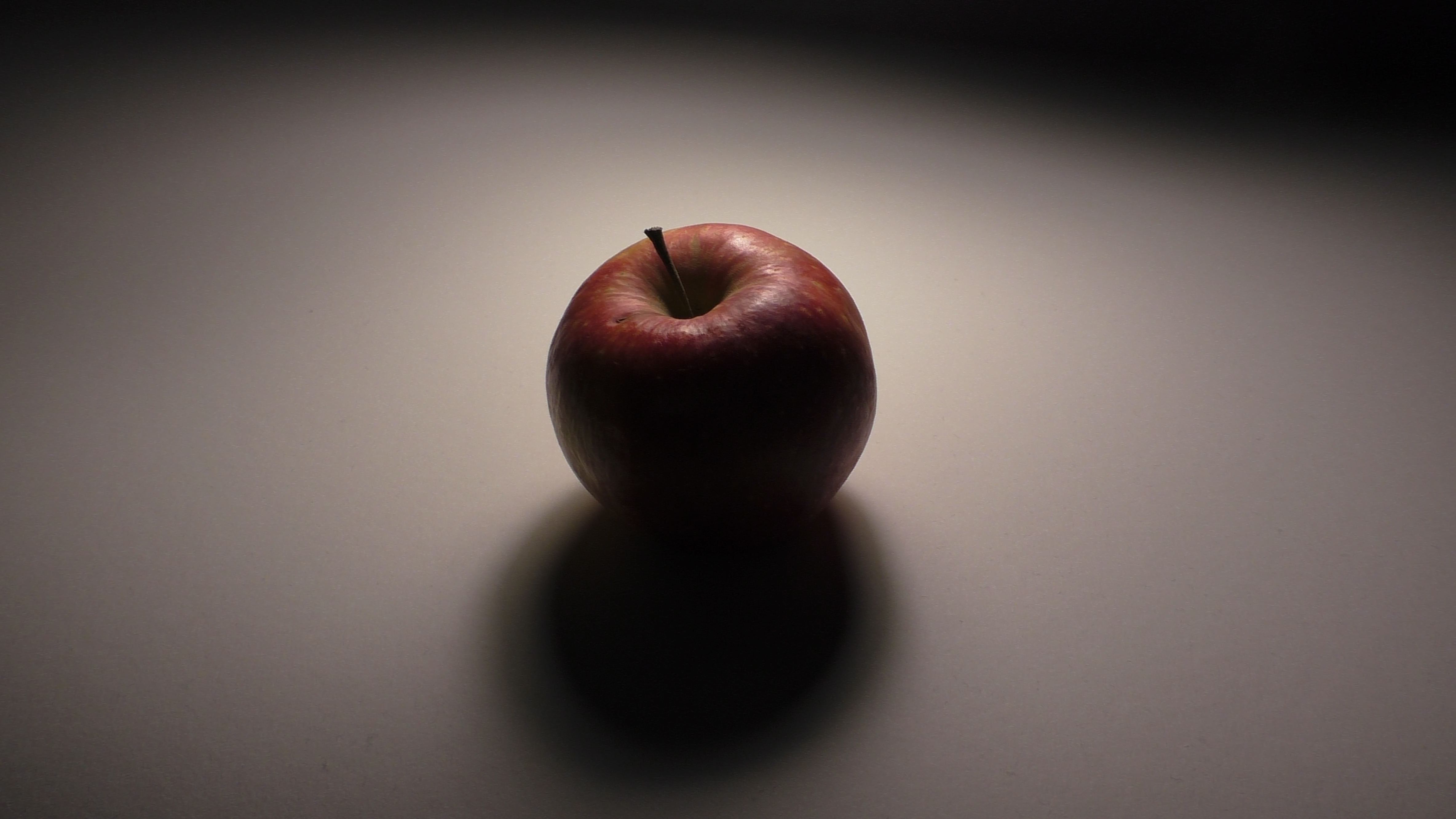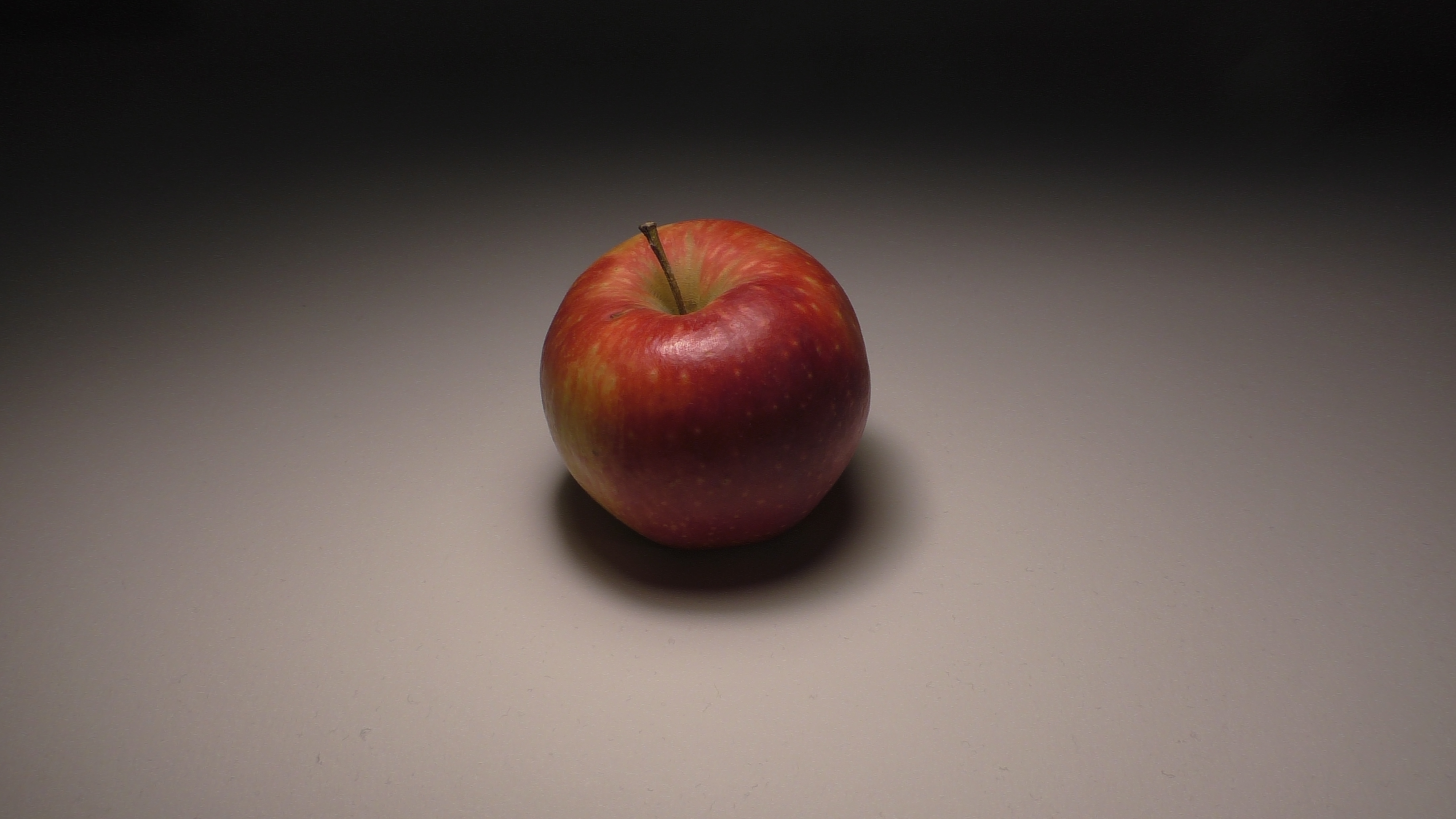 Ich habe die Bilder mit einer Panasonic HC-V757 geschossen. Die Kamera ist in fester Position, der Apfel auch. Die einzigen sich verändernden Elemente sind die Lichtquellen. Ich habe gewartet bis es Nacht war, den Raum verdunkelt und mit einer Schreibtischlampe und einem Standstrahler, den man normalerweise benutzt um eine Wand anzustrahlen, gearbeitet. Die Schreibtischlampe erzeugt diffuses Licht und der Standstrahler gerichtetes Licht. Ich habe von meinen Bildern die ausgesucht, welche in meiner Empfindung am besten aussehen. Ich hatte auch welche, auf denen ich mehrere Schatten in verschiedene Richtungen abgebildet hatte, habe sie aber hier nicht ausgesucht. Die folgenden Bilder auf denen man einen diffusen/verschwommenen Schatten erkennen kann (mitte und oben), wurden mit der Schreibtischlampe aufgenommen. Die Lichtquelle wurde in verschiedenen Positionen über den Apfel gehalten. Das dunkle Bild mit dem klar definierten Schatten (unten) wurde mit dem Strahler geschossen. Der Strahler hat, wie man sich denken kann, nicht direkt auf den Apfel gezeigt, sondern auf einen Punkt räumlich hinter dem Apfel liegend.
