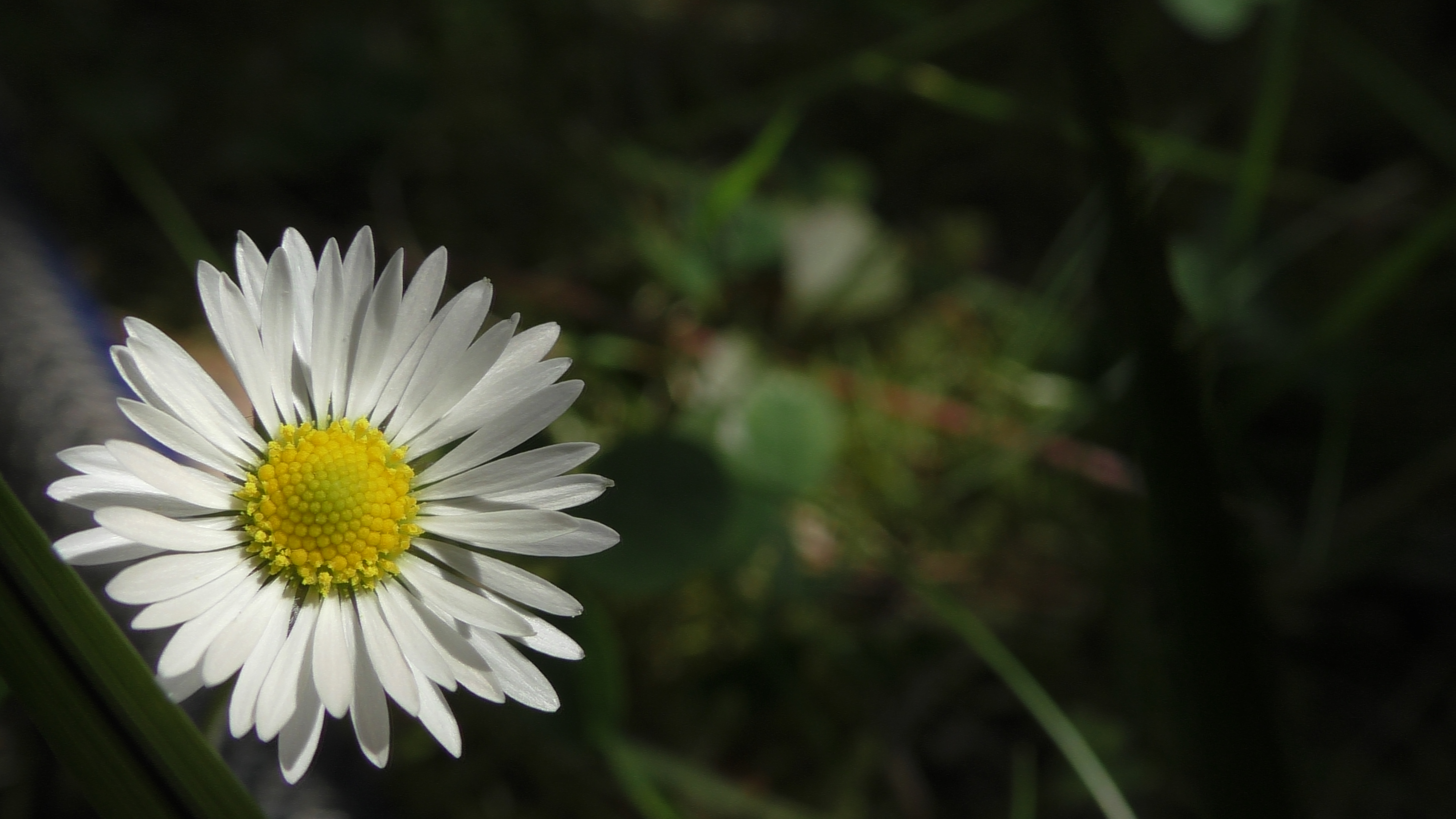 Das zweite Bild (mitte) zeigt ein Gänseblümchen in Nahaufnahme. Im Hintergrund kann man Lichteinfall auf Rasen erkennen. Am linken Rand kann man etwas verschwommen Blaues erkennen. Es handelt sich hier um einen Gartenschlauch. Das Bild scheint das Thema „Mikrokosmos Garten“ zu vermitteln. Besonders interessant finde ich auch den Schatten der einzelnen Gänseblümchenblätter, der die anderen Blätter überlappt.