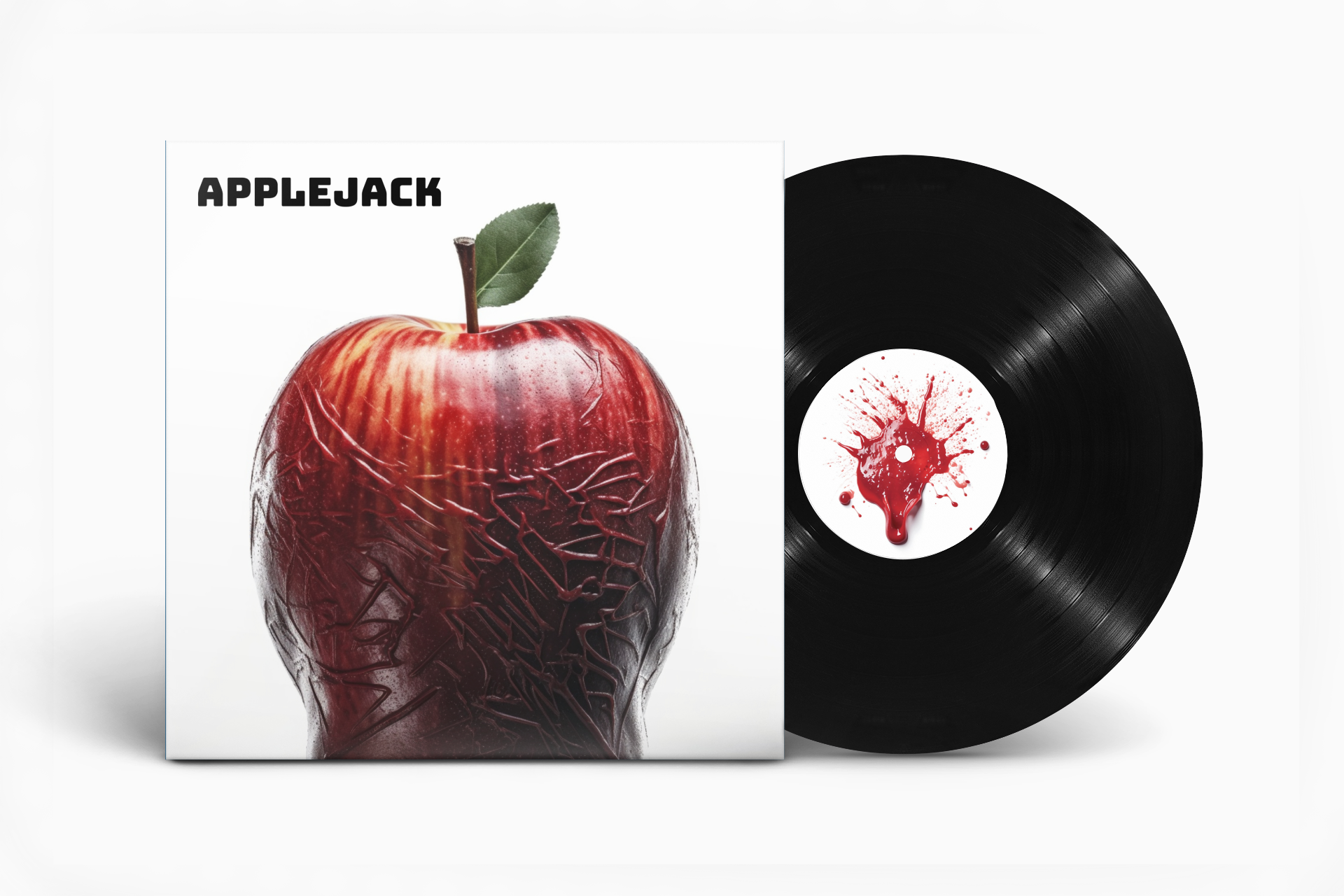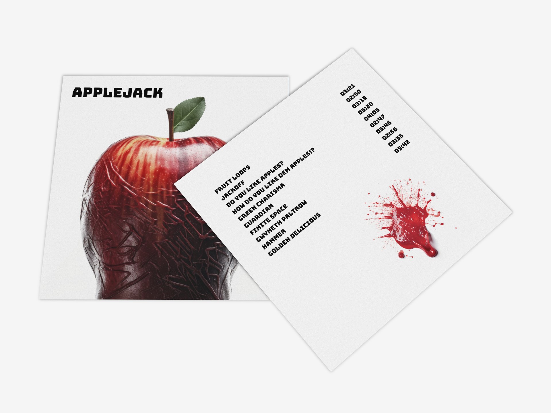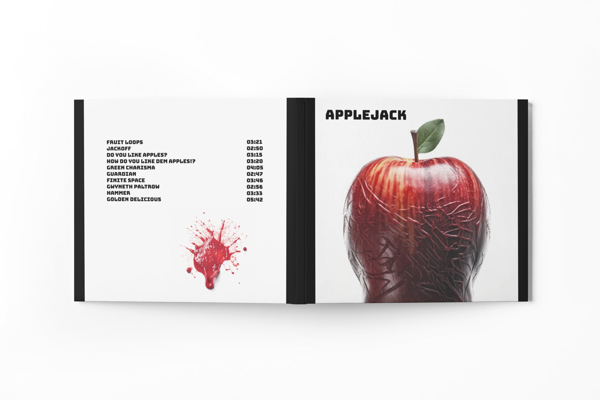 Das Album ist vom fiktiven Künstler „Applejack“ und das ist auch der Name dieses Albums. Das Genre ist Rap/Hiphop-Musik. Die schwere, blockartige Natur der Schrift und die fetten graffitiartigen Buchstaben lassen sich mit diesem Musikgenre assoziieren. Die verwendete Schriftart ist Bungee. Die Schriftart ist ebenfalls simpel und lesbar und ich finde, dass die Schriftart so den anderen Bildelementen die Chance gibt vordergründig zu wirken. Der Hintergrund ist weiß gehalten. Dies soll die minimalistische Wirkung des Gesamtbildes verstärken. Das Bildelement auf der Vorderseite (veränderter Apfel) des Albumcovers wurde mit Midjourney (Künstliche Intelligenz, die in der Lage ist KI-Kunst zu erschaffen) generiert, ebenfalls das Bildelement auf der Rückseite (Marmeladenklecks). Ich denke die Interpretation dieser Bildelemente lässt viele verschiedene Perspektiven zu und ich überlasse dies dem Leser. Ich habe diese Bildelemente wegen der vielfältigen Interpretationsmöglichkeiten gewählt.