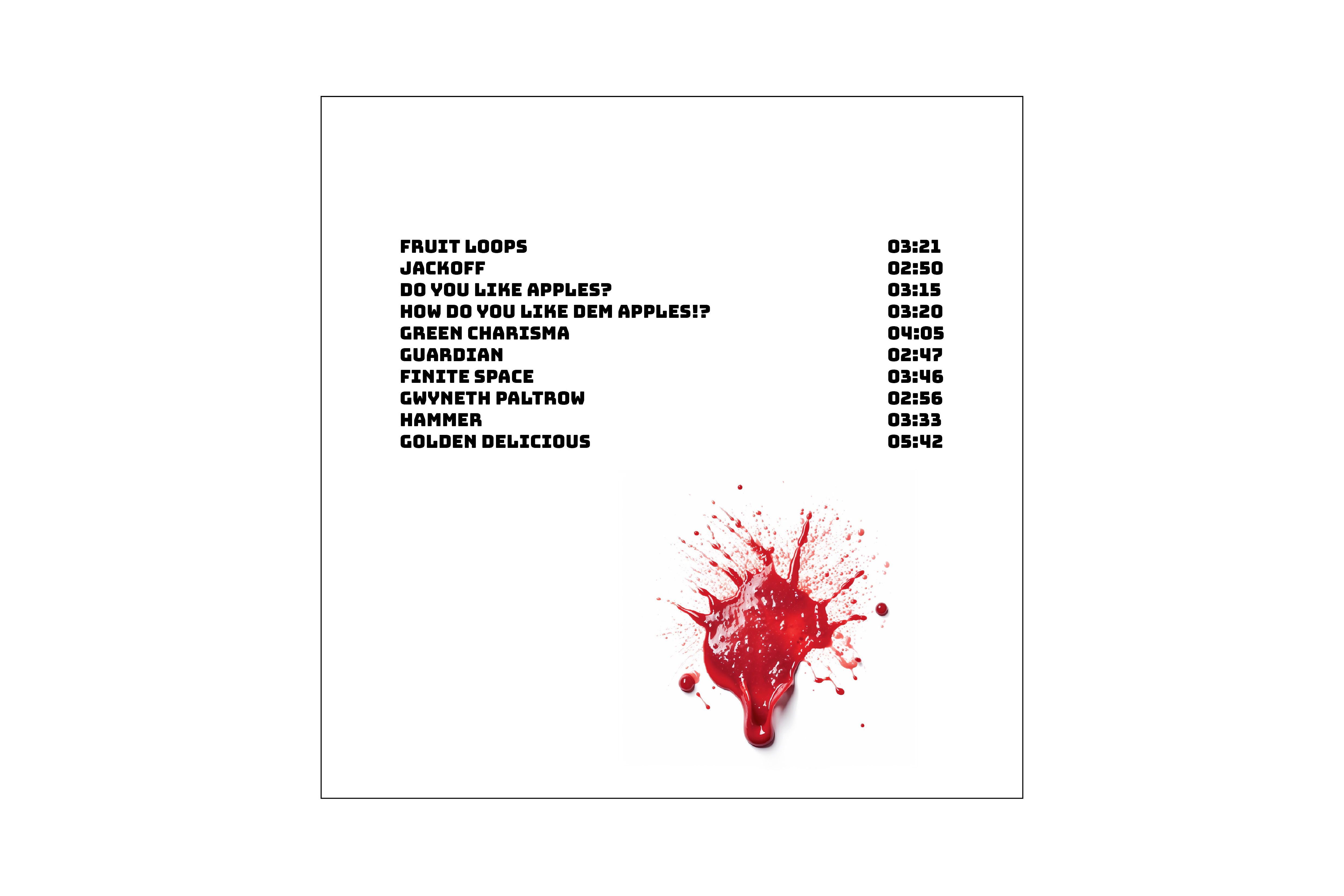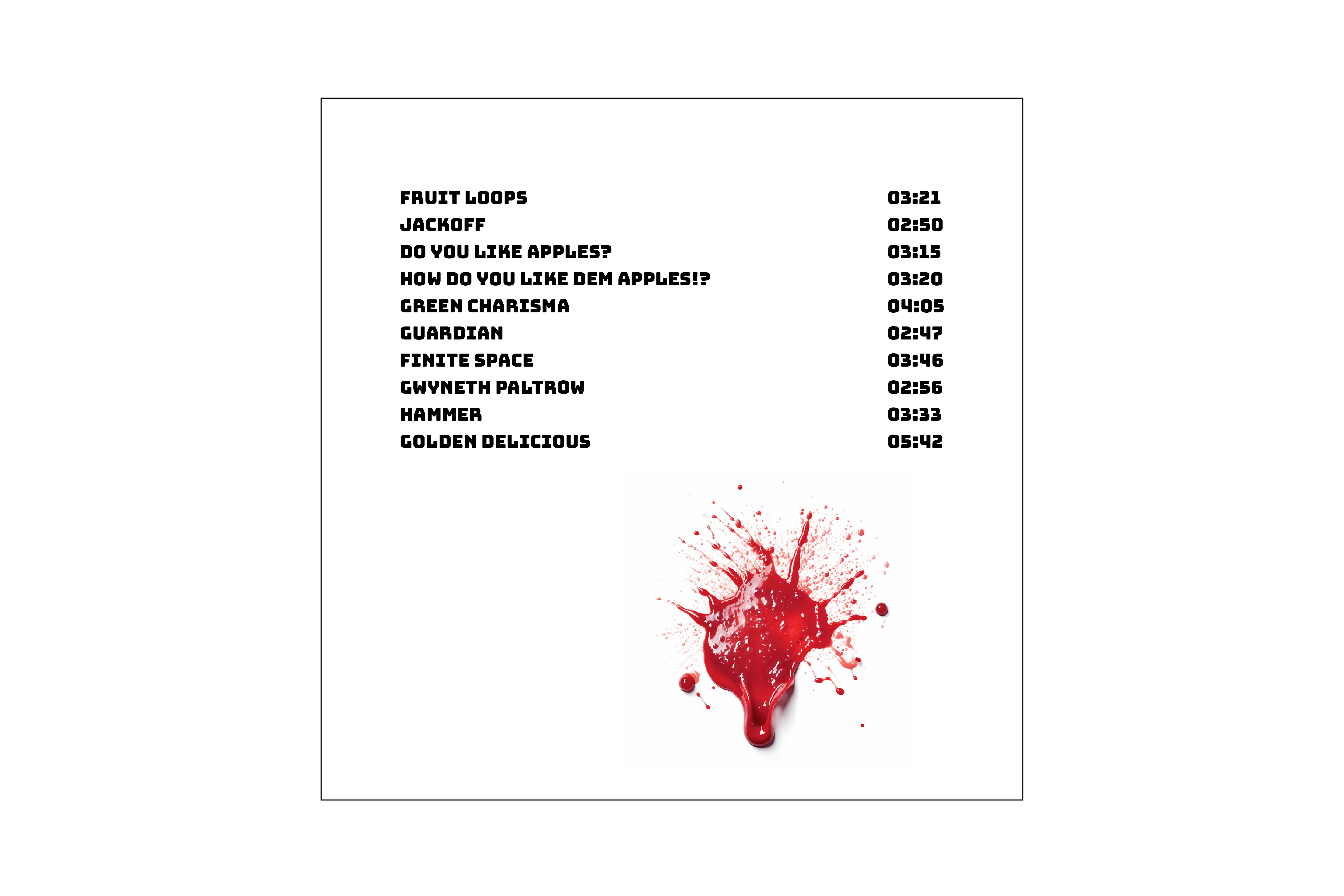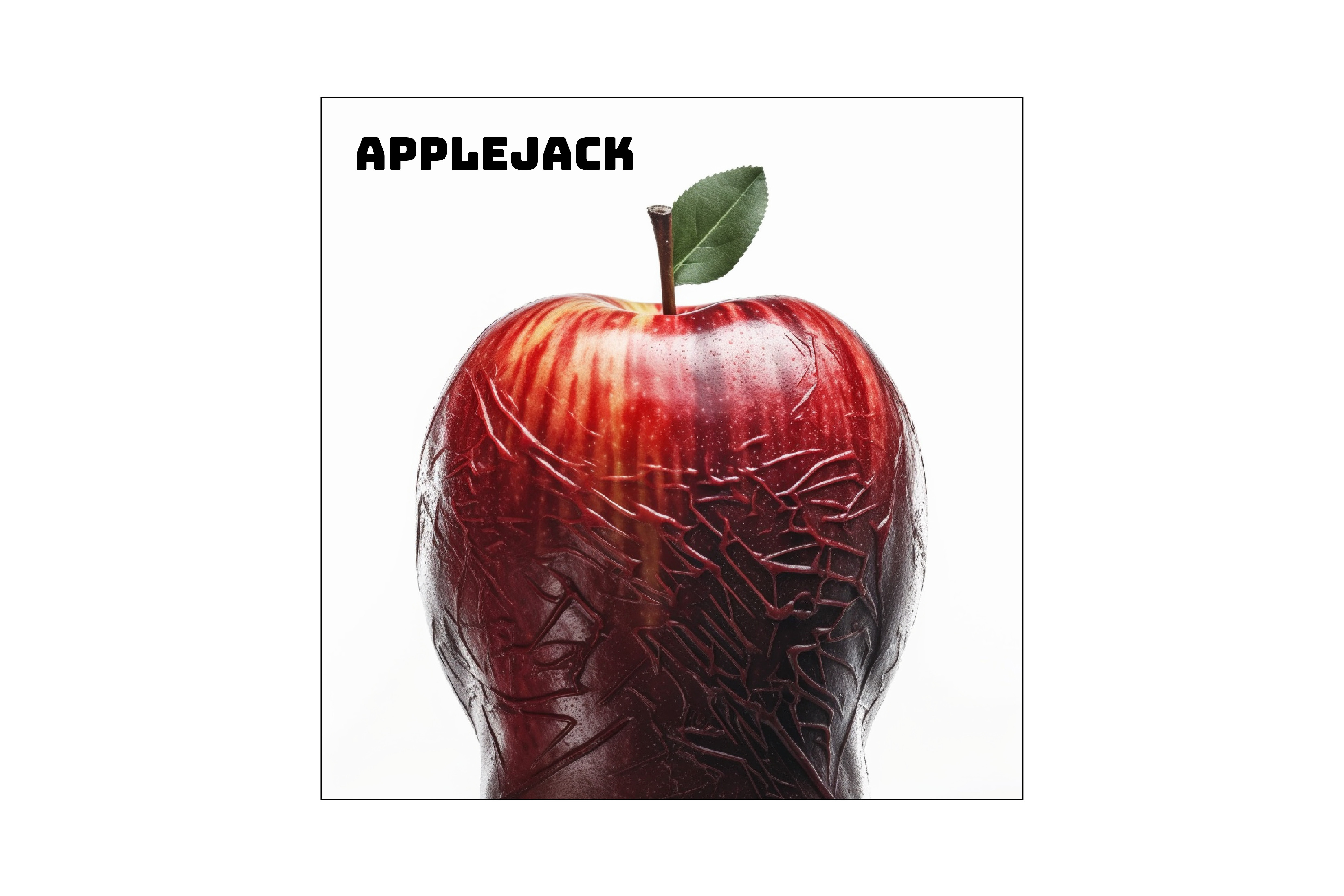 Das Album ist vom fiktiven Künstler „Applejack“ und das ist auch der Name dieses Albums. Das Genre ist Rap/Hiphop-Musik. Die schwere, blockartige Natur der Schrift und die fetten graffitiartigen Buchstaben lassen sich mit diesem Musikgenre assoziieren. Die verwendete Schriftart ist Bungee. Die Schriftart ist ebenfalls simpel und lesbar und ich finde, dass die Schriftart so den anderen Bildelementen die Chance gibt vordergründig zu wirken. Der Hintergrund ist weiß gehalten. Dies soll die minimalistische Wirkung des Gesamtbildes verstärken. Das Bildelement auf der Vorderseite (veränderter Apfel) des Albumcovers wurde mit Midjourney (Künstliche Intelligenz, die in der Lage ist KI-Kunst zu erschaffen) generiert, ebenfalls das Bildelement auf der Rückseite (Marmeladenklecks). Ich denke die Interpretation dieser Bildelemente lässt viele verschiedene Perspektiven zu und ich überlasse dies dem Leser. Ich habe diese Bildelemente wegen der vielfältigen Interpretationsmöglichkeiten gewählt.